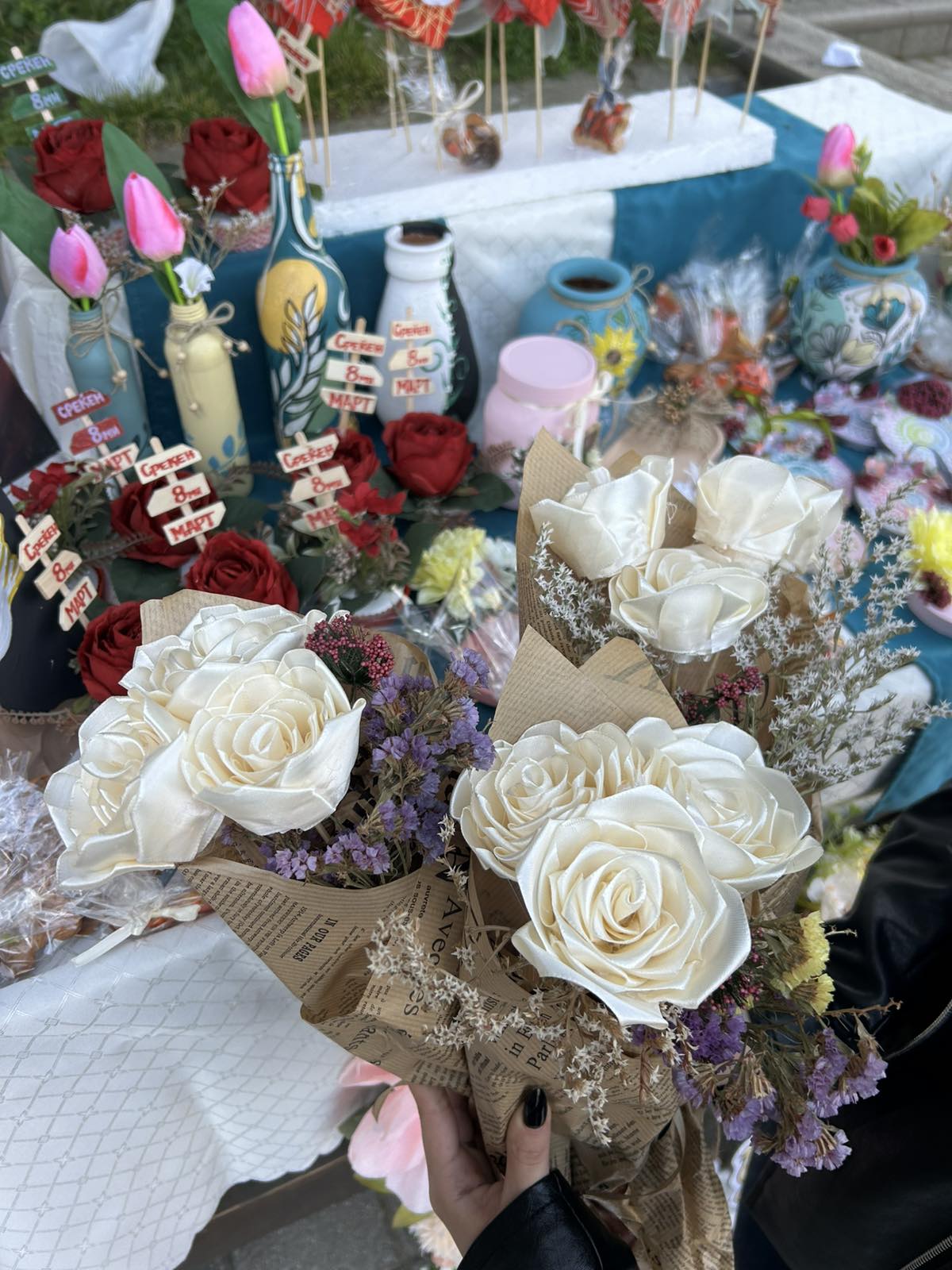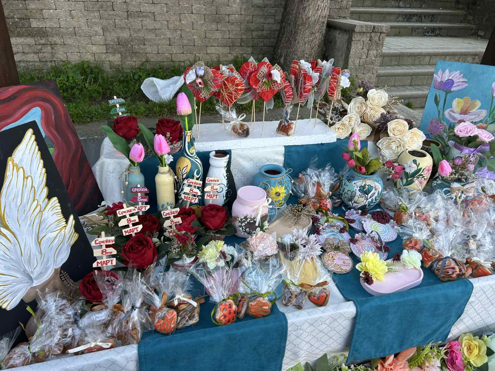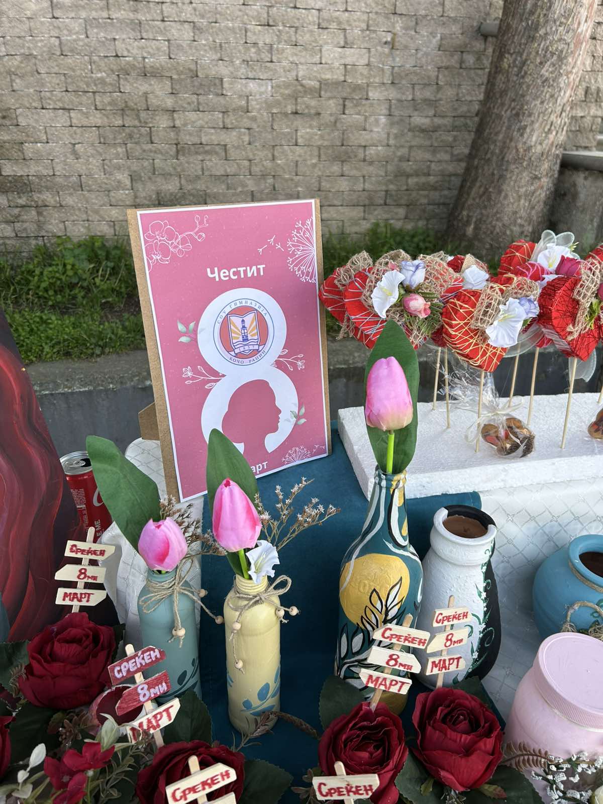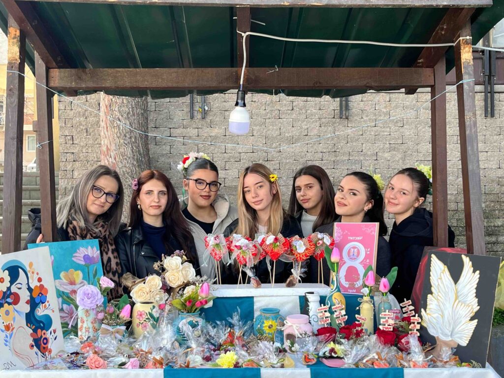 Во пресрет на Денот на жената 8 Март, а во организација на Општина Велес, денес на училиштниот базар на кој учествуваа ученици од основните и средните училишта во градот, се изложија прекрасни изрботки од вредните раце на нашите гимназијалци.Учениците се подготвуваа под менторство на професорката по Ликовна уметност, Јулијана Михова. Голема благодарност и до професорката Благица Аризанова Шопов која се погрижи за изработката на постерот за штандот на кои беа изложени изработките на нашите ученици. Упатуваме честитки на сите жени, мајки, припаднички на женскиот пол по повод 8 Март, Меѓународниот ден на жената.