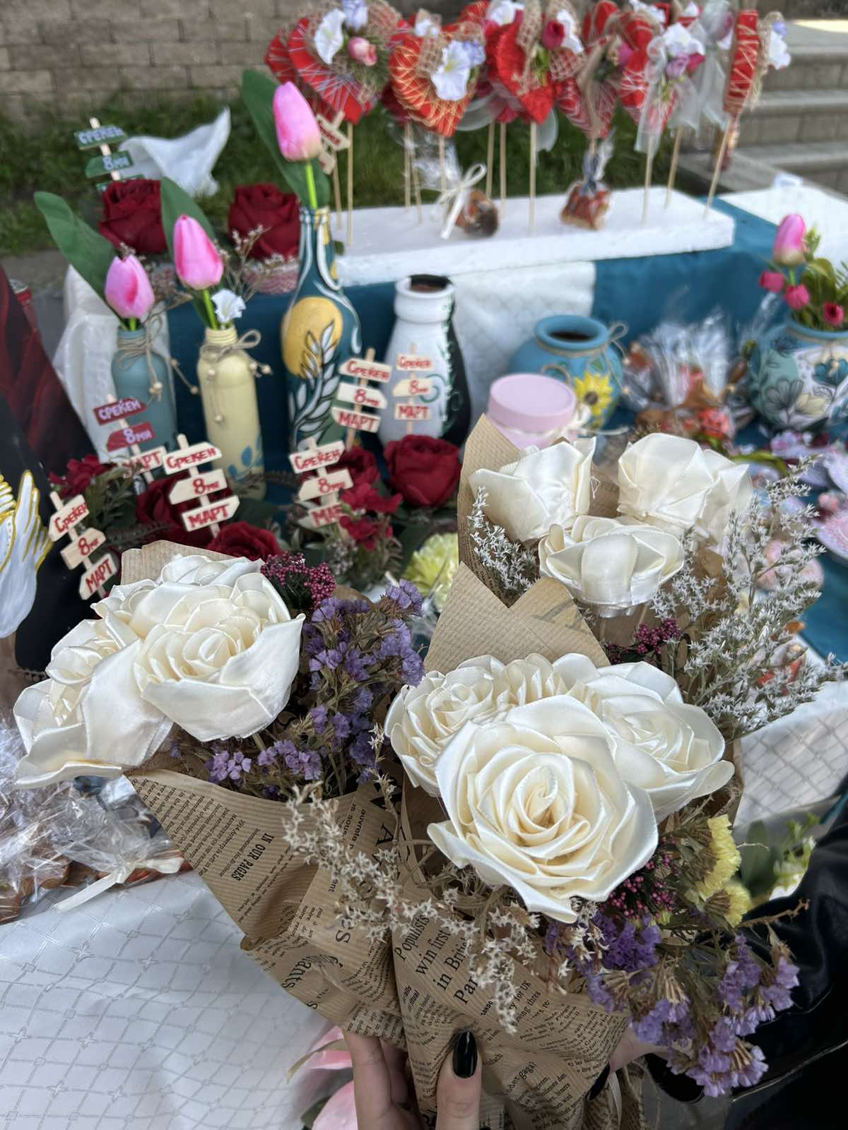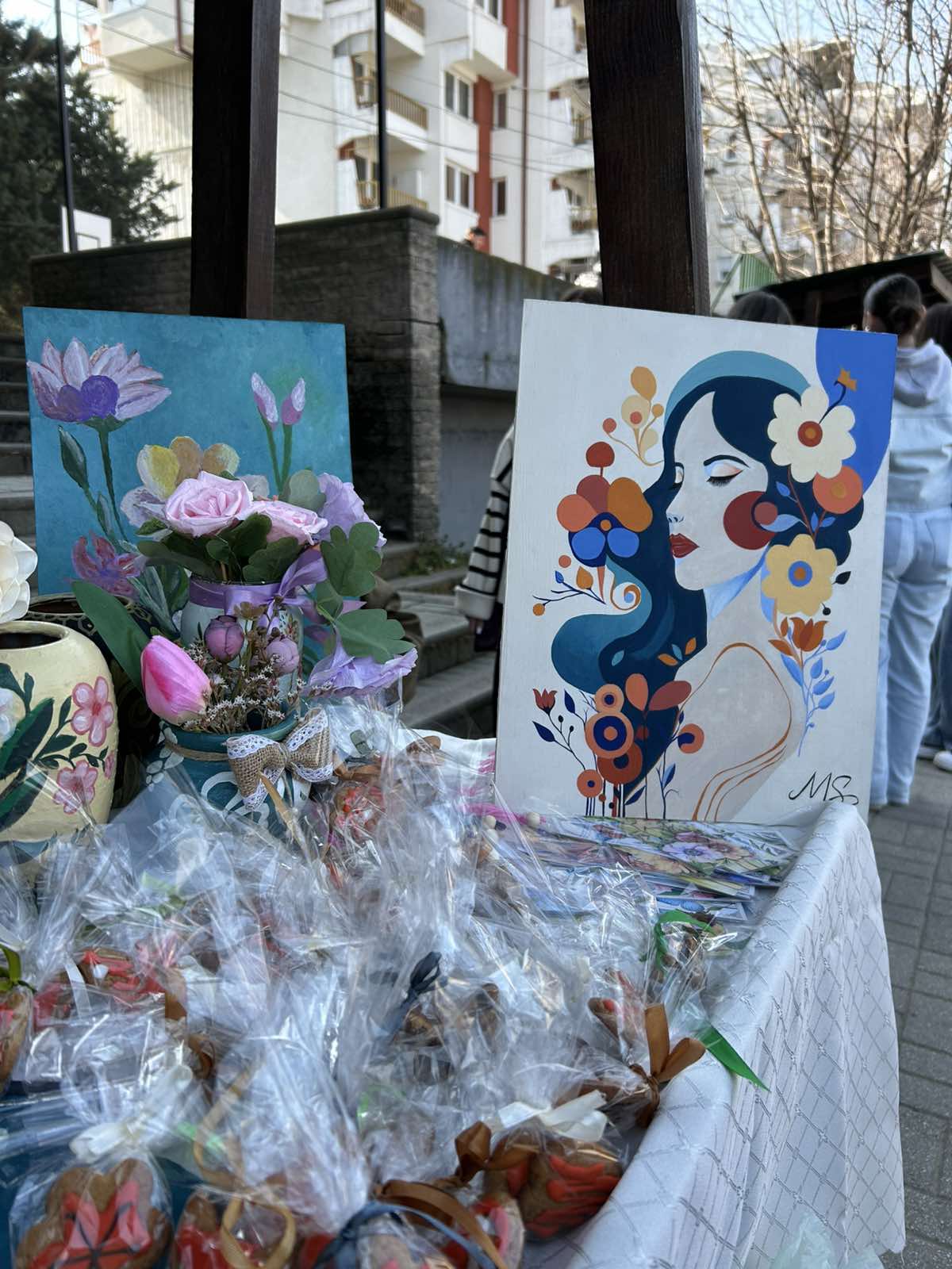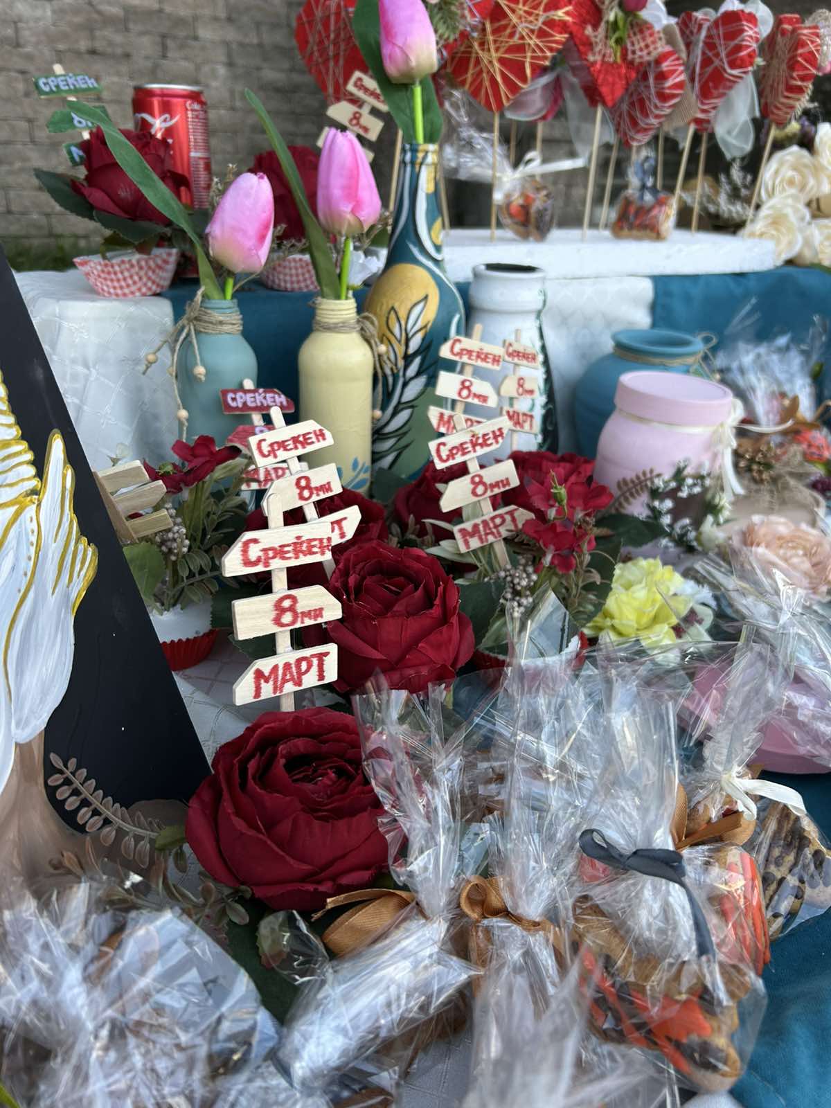 Во пресрет на Денот на жената 8 Март, а во организација на Општина Велес, денес на училиштниот базар на кој учествуваа ученици од основните и средните училишта во градот, се изложија прекрасни изрботки од вредните раце на нашите гимназијалци.Учениците се подготвуваа под менторство на професорката по Ликовна уметност, Јулијана Михова. Голема благодарност и до професорката Благица Аризанова Шопов која се погрижи за изработката на постерот за штандот на кои беа изложени изработките на нашите ученици. Упатуваме честитки на сите жени, мајки, припаднички на женскиот пол по повод 8 Март, Меѓународниот ден на жената.